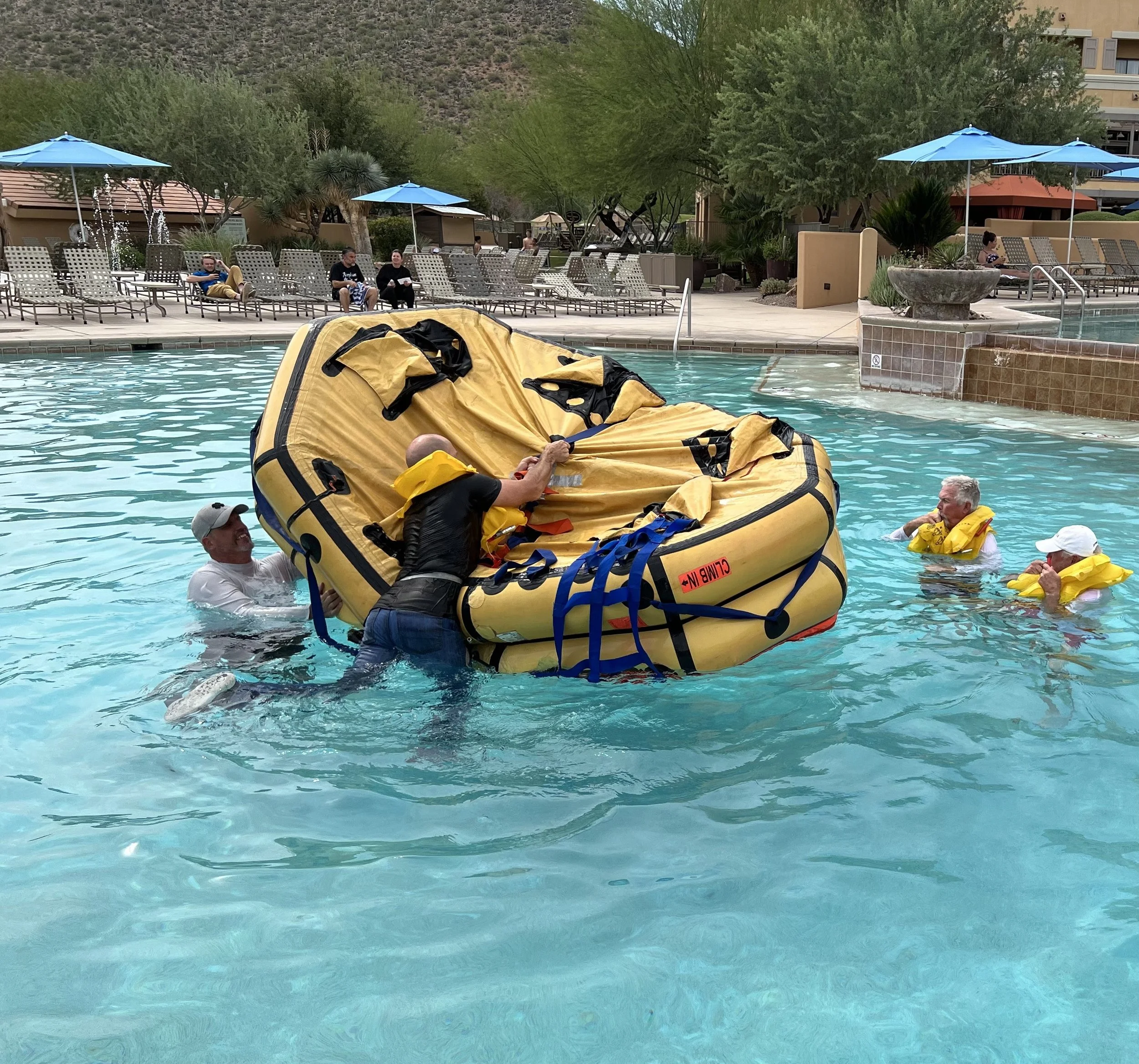 Our second task simulated escaping the cockpit of a ditched plane. After we strapped ourselves into a mock cockpit, Gunnar dunked us underwater. We were then required to undo the seat belt and swim out through the designated window. I managed to make the exercise more realistic by cracking my head on the chair while getting INTO the dunk tank. While this exercise in the resort pool (complete with non-convention guests eyeing us oddly) was surely less hectic than escaping a plane actually ditched into the sea between Miami and the Bahamas, the training was eye-opening and educational nonetheless.